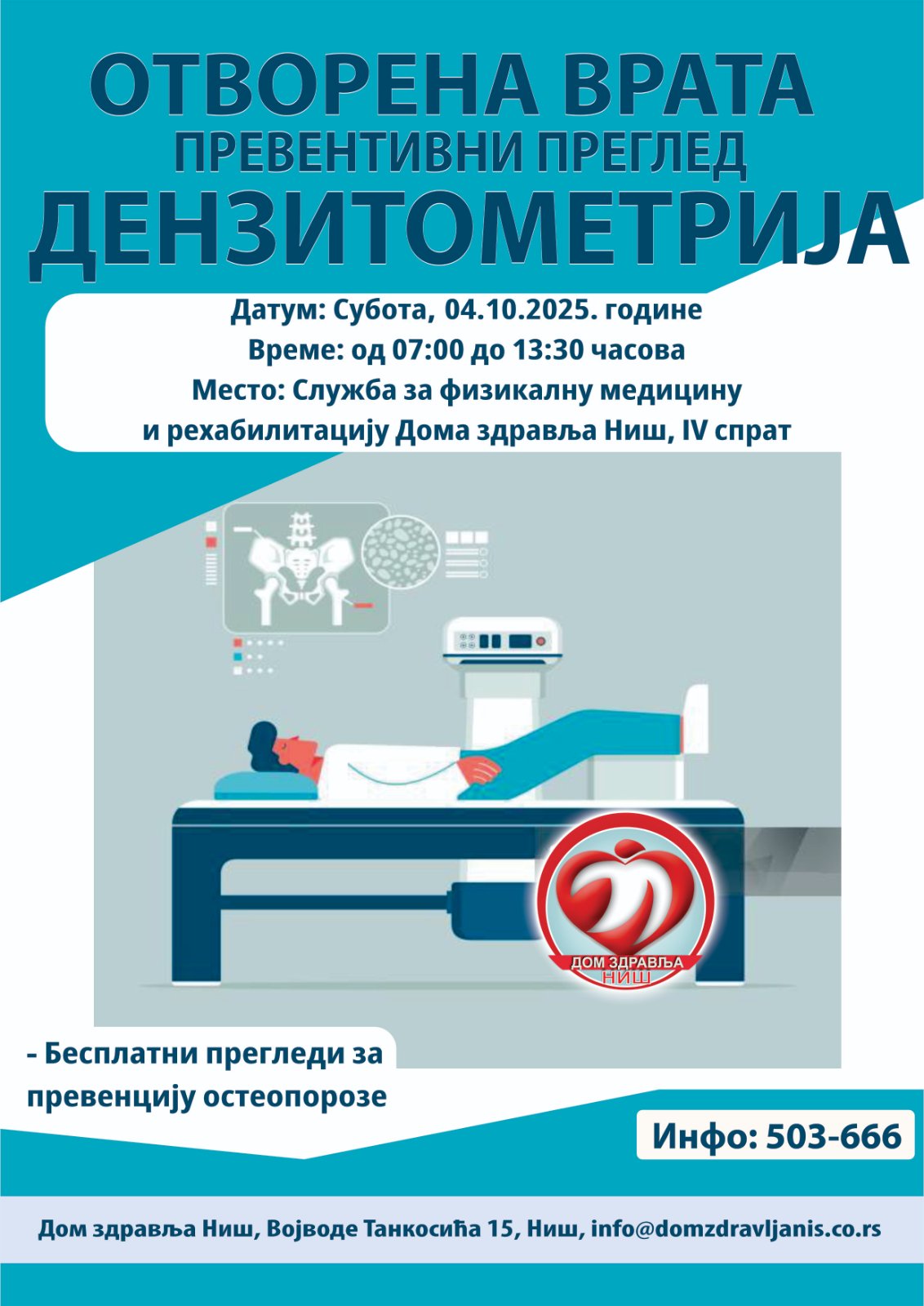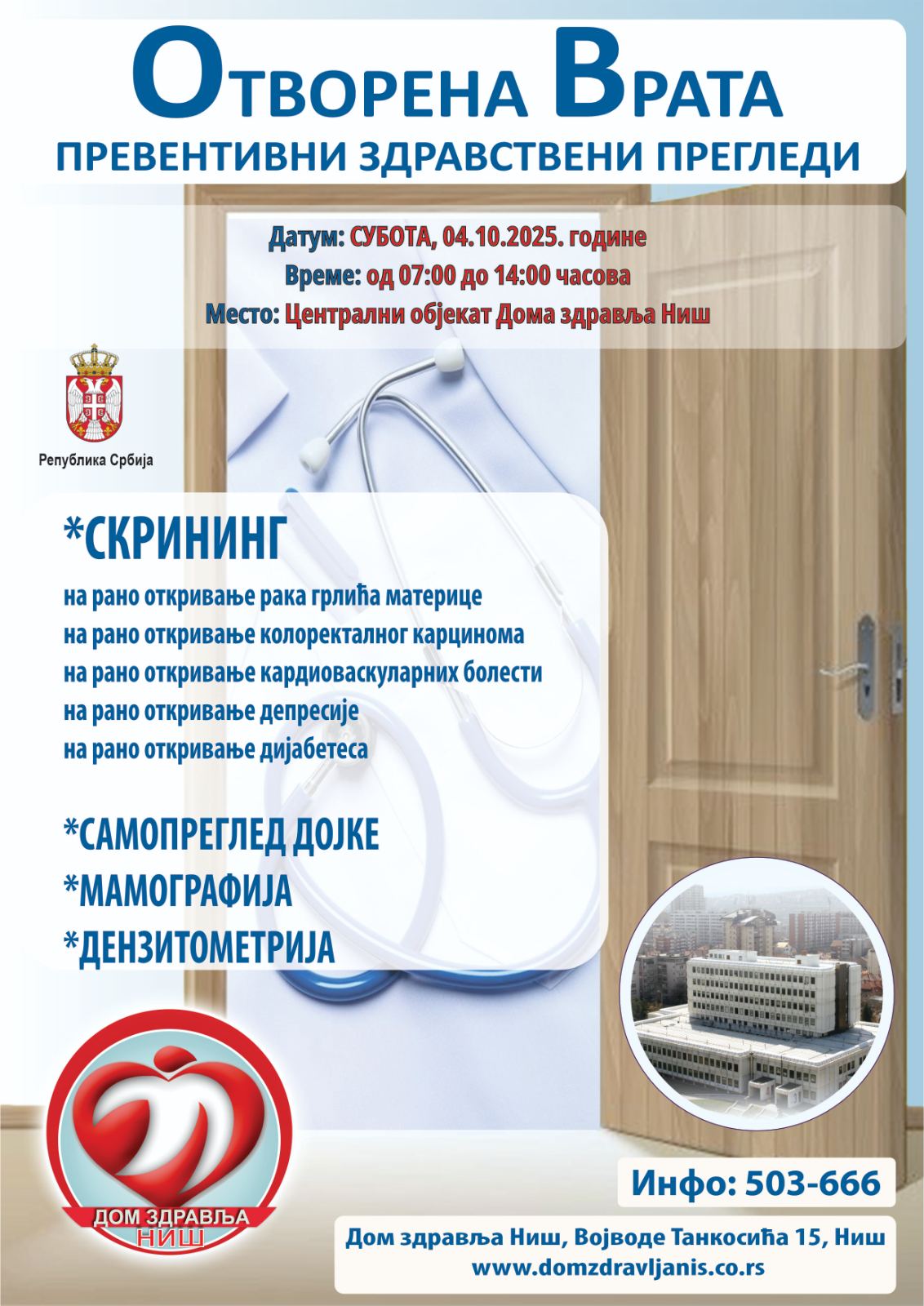 Дом здравља Ниш је ангажовао бројне медицинске екипе да за грађане у централном холу организују 04.10.2025. године у периоду од 07:00 до 14:00 часова акцију превентивних прегледа под називом „Отворена врата“.