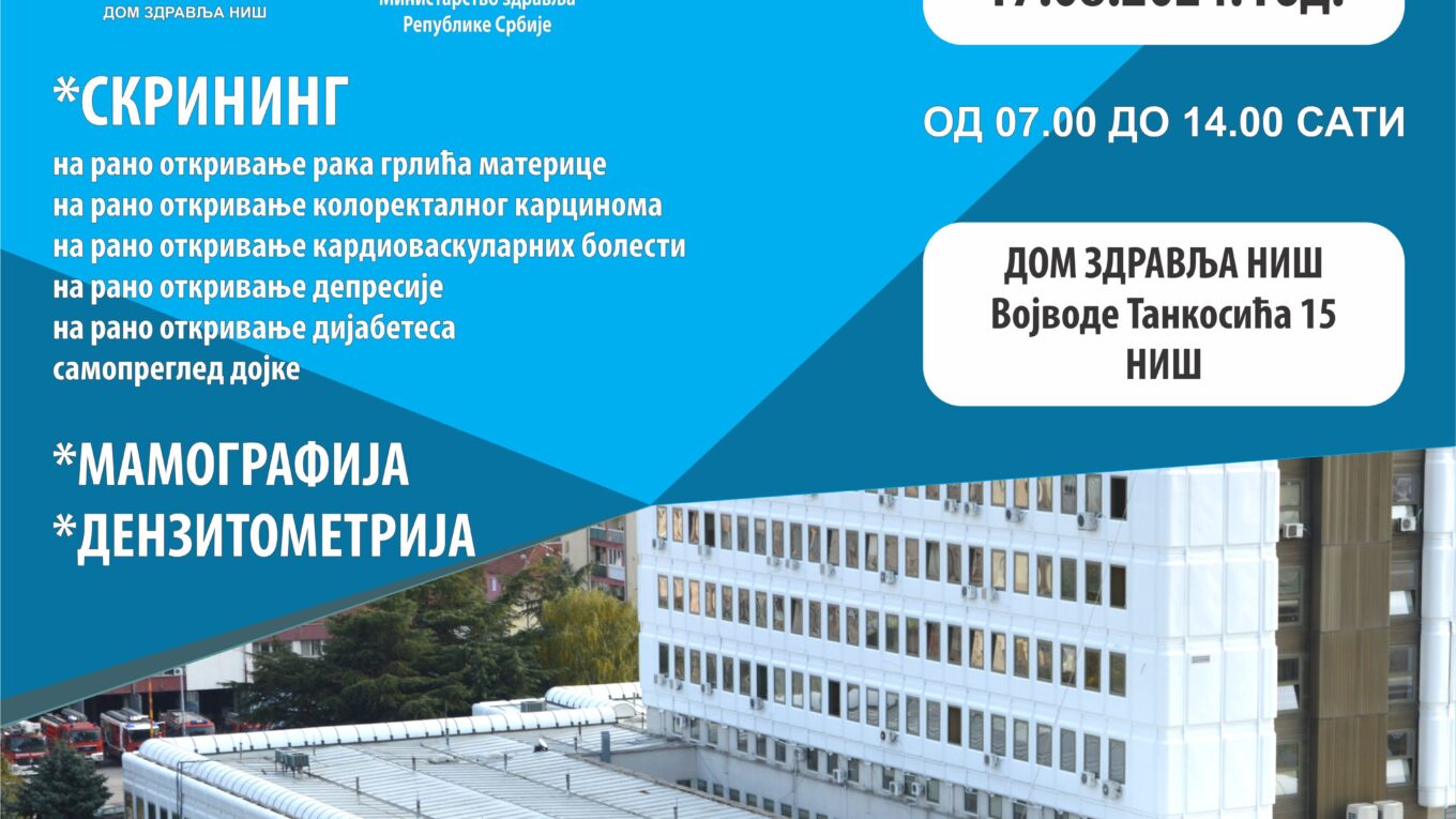 - Служба за здравствену заштиту жена позива све жене старосне доби од 25-64 године да ураде скрининг на рано откривање карцинома грлића материце – ПАПА тест. Узимање бриса радиће се на I спрату, ординација бр. 55, у простору Службе за здравствену заштиту жена у централном објекту Дома здравља Ниш;