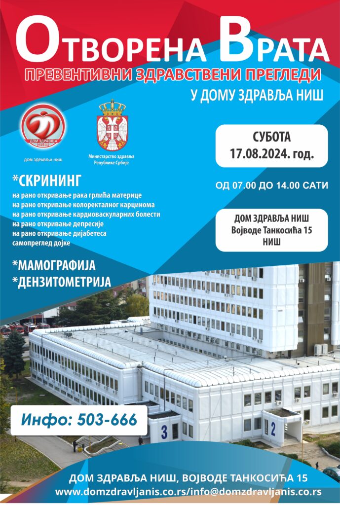 Имајући све то у виду, Дом здравља Ниш вам пружа прилику, да проверите своје здравље кроз акцију ,,Отворена врата“ у суботу 17.08.2024.године у периоду од 07:00 до 14:00 часова.