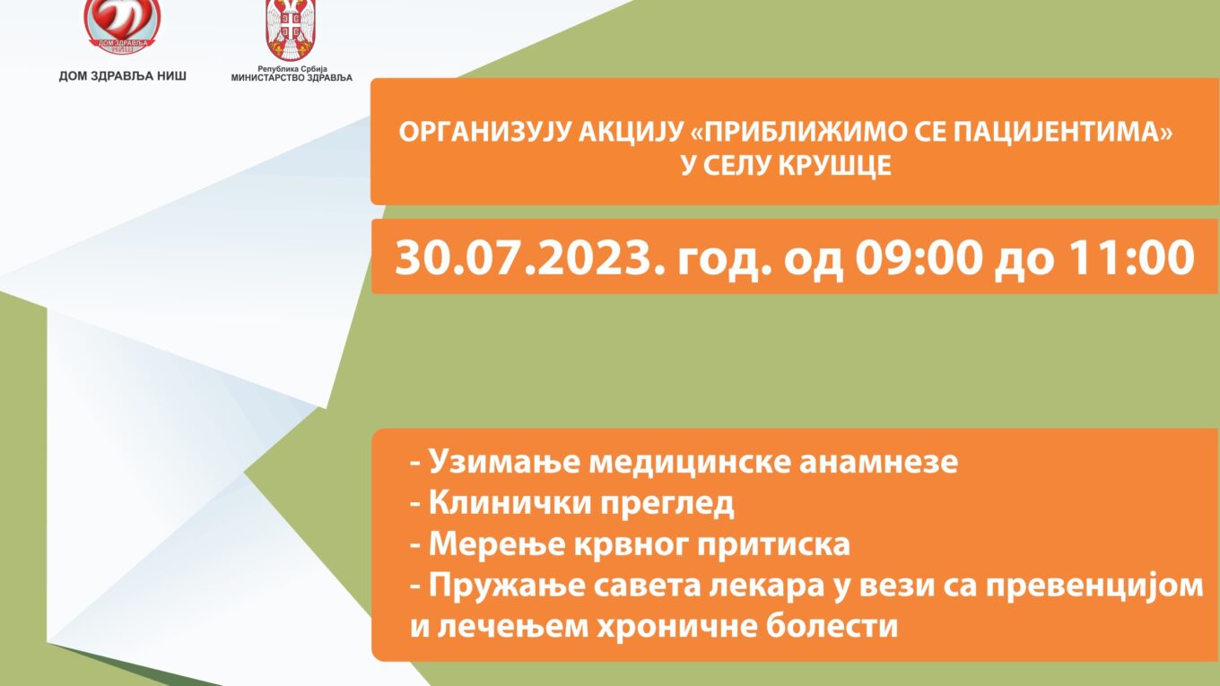 Медицинска екипа Дома здравља Ниш у недељу 30.07.2023. године у периоду од 09: до 11:00 часова обавиће прегледе мештана села Крушце под називом „Приближимо се пацијентима“. Поред превентивних и скрининг прегледа обавиће се и здравствено-васпитни рад и едукација свих заинтересованих особа.