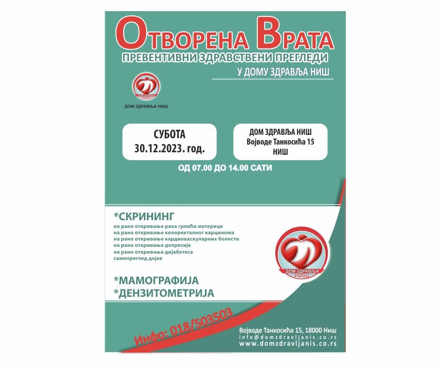 Дом здравља Ниш у суботу 30.12.2023. године у централном објекту, у периоду од 07:00 до 14:00 часова организује акцију „Отворена врата“ за превентивне и скрининг прегледе. Молимо суграђане да одвоје пар сати и провере своје здравље и тиме спрече настанак болести као и компликацијa.