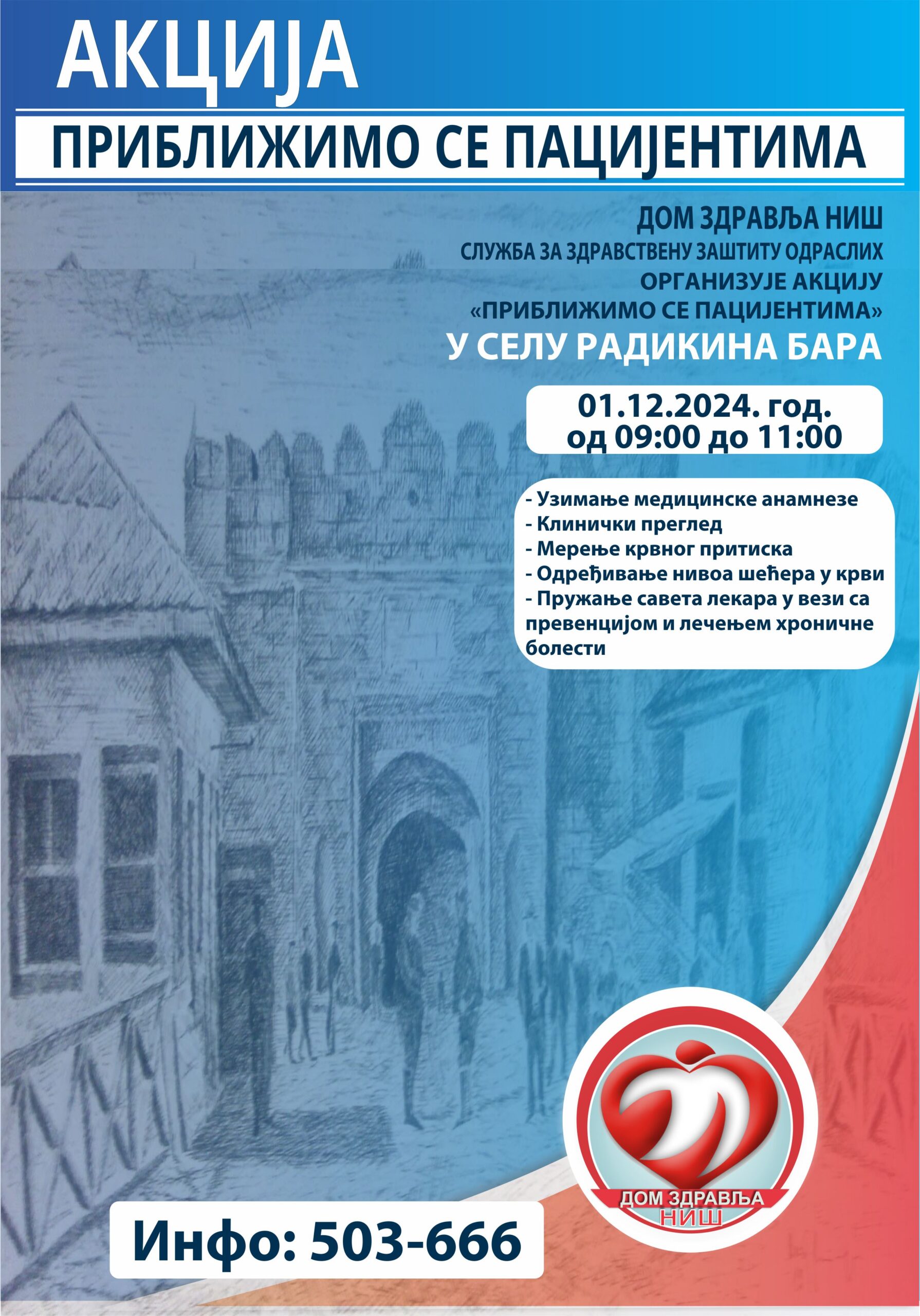 У недељу 01.12.2024. године, медицинска екипа Дома здравља Ниш обавиће прегледе мештана села Радикина Бара у току акције под називом „Приближимо се пацијентима“.