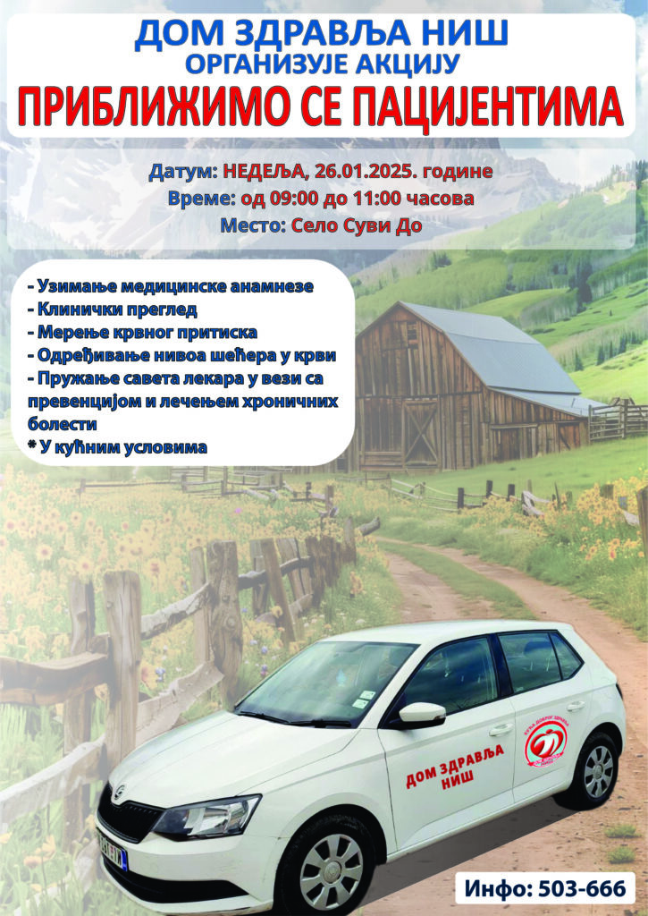 У недељу 26.01.2025. године, медицинска екипа Дома здравља Ниш обавиће прегледе мештана насеља Суви До под називом „Приближимо се пацијентима“. Осим основних
