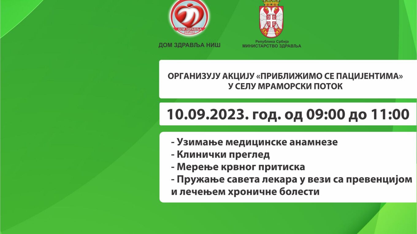 Недеља 10.09.2023. године у периоду од 09:00 до 11:00 часова је дан да здравствени радници из Службе за здравствену заштиту одраслих Дома здравља Ниш, приближе здравствену заштиту мештанима села „Мраморски поток“. Прегледи ће бити реализовани у објекту или кућним условима у зависности да ли су мештани покретни или отежано покретни.