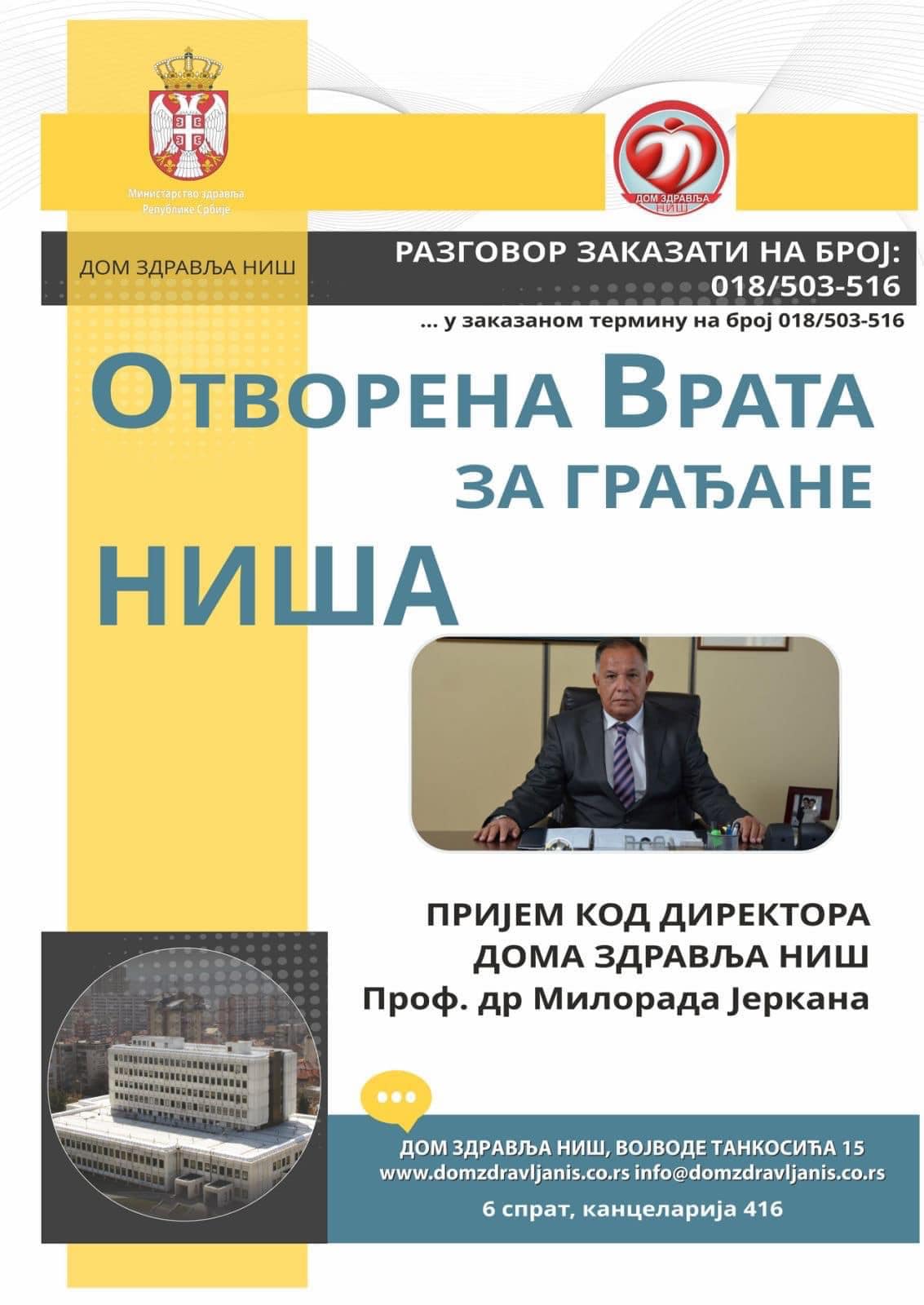 У жељи да помогне грађанима, али и да прихвати сугестије и унапреди рад у примарној здравственој заштити директор Дома здравља Ниш проф. др Милорад Јеркан, организује пријем грађана сваке суботе у заказаном термину.