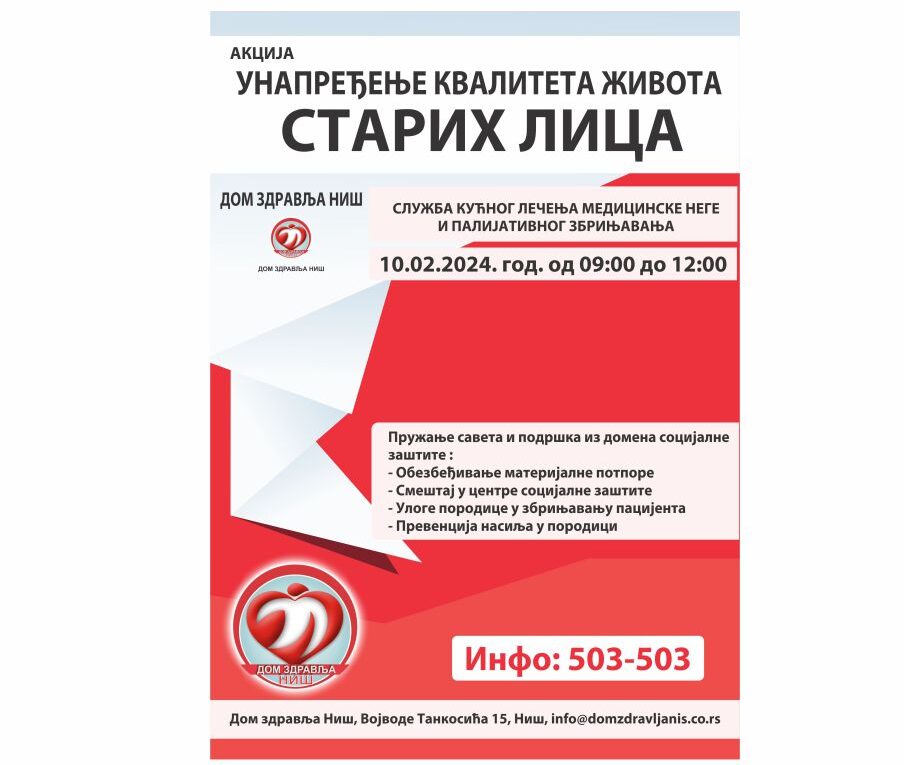 У централном холу Дома здравља Ниш у суботу 10.02.2024. године у периоду од 09:00 до 12:00 часова биће организоване активности пружања савета из домена социјалне заштите. Социјалне раднице Службе за кућно лечење, медицинску негу и палијативно збрињавање овом приликом пружаће савете о могућностима остваривања права из домена социјалне заштите.
