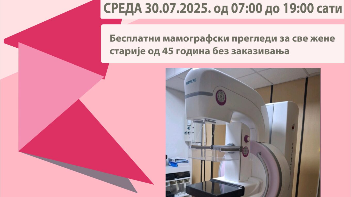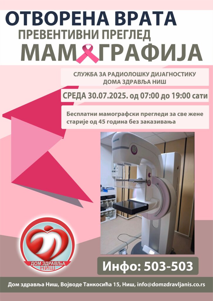 Мамографски преглед можете урадити у Служби за рендген дијагностику Дома здравља Ниш у оквиру акције „Отворена врата за мамографију“ у среду 30.07.2025. године у периоду од 07:00 до 19:00 часова.