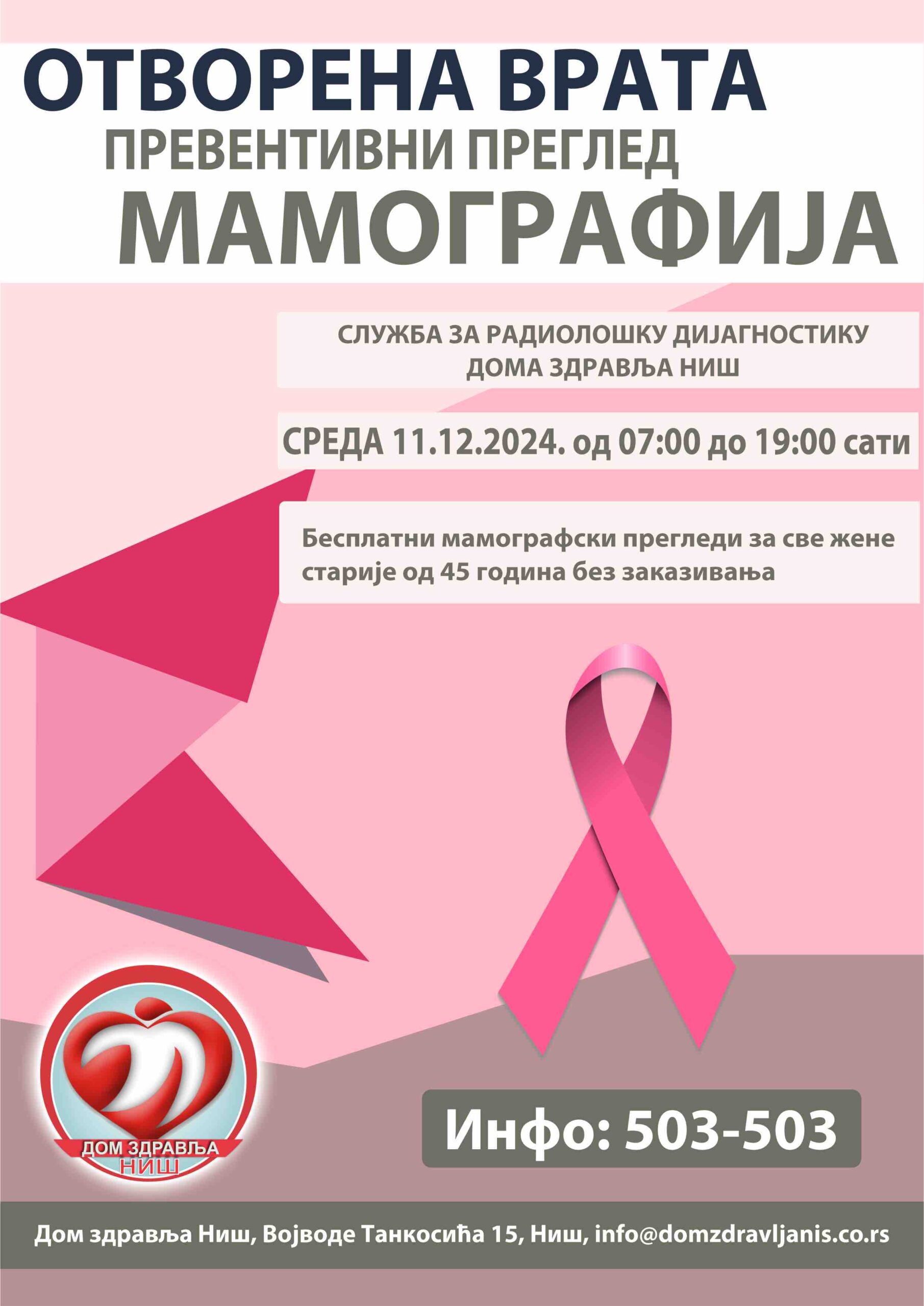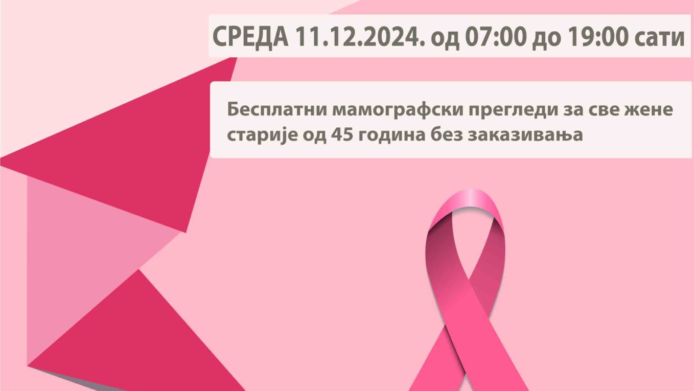 Мамографски преглед можете урадити у Служби за рендген дијагностику Дома здравља Ниш у оквиру акције „Отворена врата за мамографију“ у среду 11.12.2024. године у периоду од 07:00 до 19:00 часова. Радиолошки техничар ће вас водити кроз све кораке прегледа и водиће рачуна да смањи дискомфор током компресије дојке.
