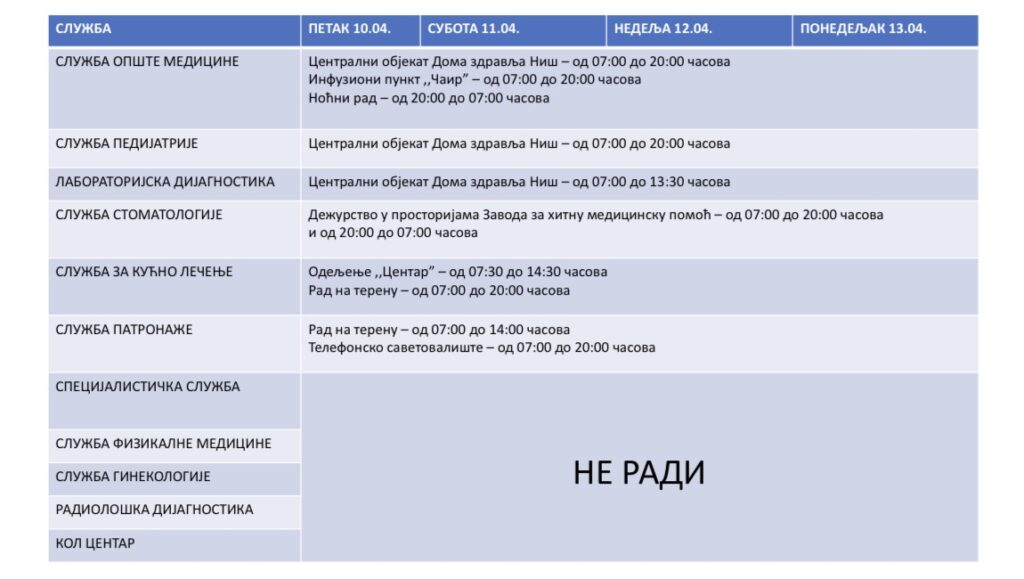 РАСПОРЕД ДЕЖУРСТВА ДОМА ЗДРАВЉА НИШ ЗА ВРЕМЕ УСKРШЊИХ ПРАЗНИКА 10., 11., 12. И 13. АПРИЛА 2026. ГОДИНE