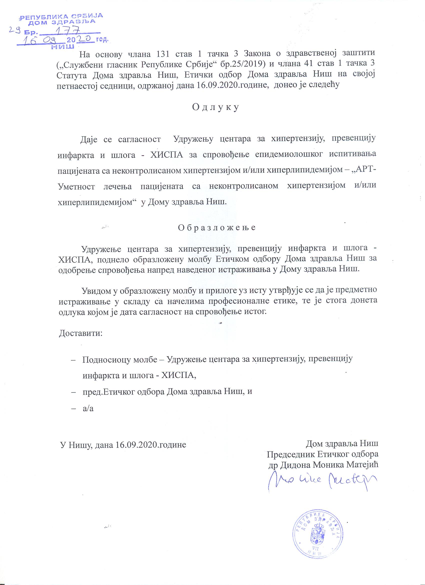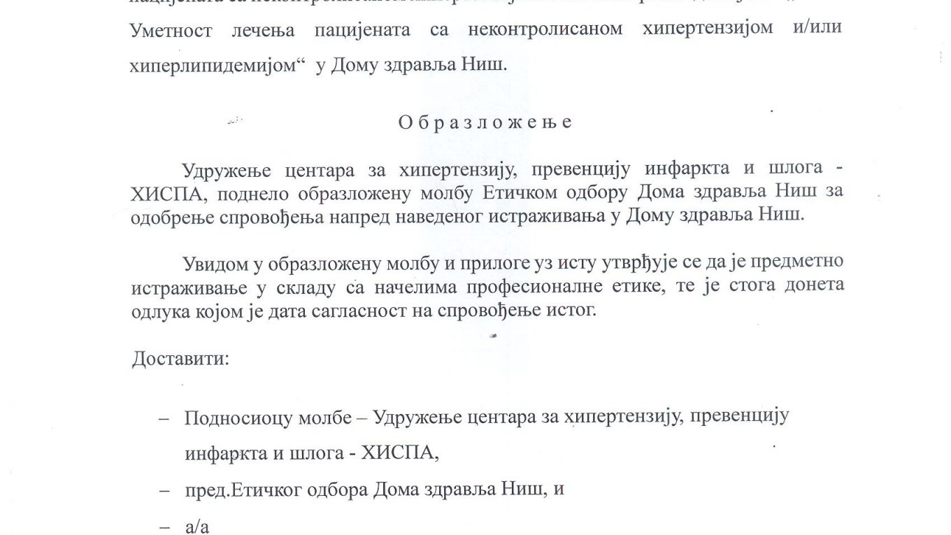 Сагласност Удружењу центра за хипертензију, превенцију инфаркта и шлога – ХИСПА за спровођење епидемиолошког испитивања пацијената са неконтролисаном хипертензијом и/или хиперлипидемијом..