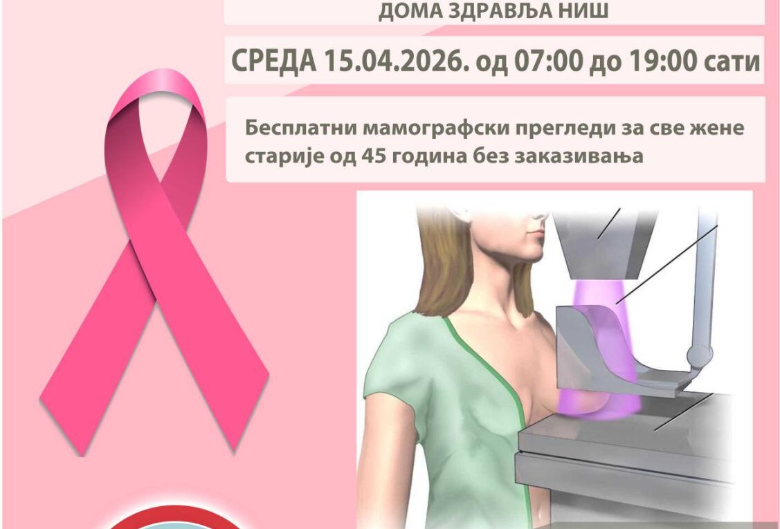 Дана 15.04.2026. године, у Служби за радиолошку дијагностику Дома здравља Ниш биће организована акција „Отворена врата за мамографију“ намењена женама старосне доби од 45 до 69 година живота без упута и заказивања.