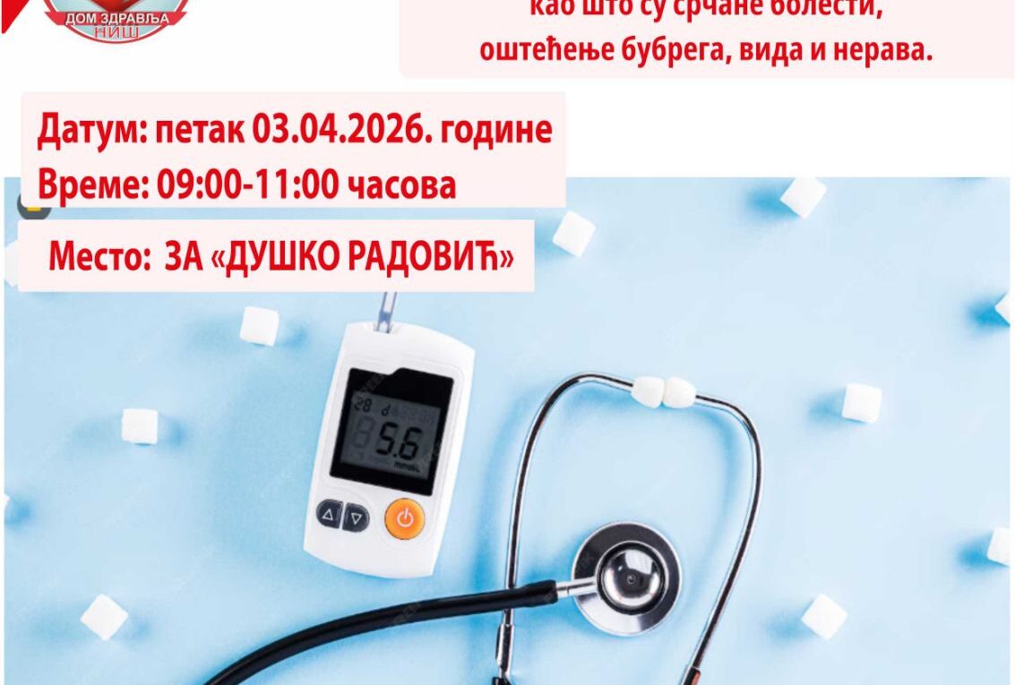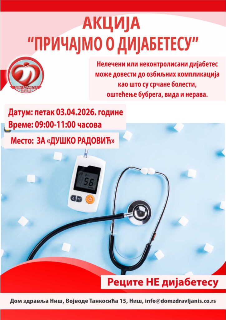 У здравственoj станици „Душко Радовић“ дана 03.04.2026. године од 09:00 до 11:00 часова, Центар за превентивне здравствене услуге Дома здравља Ниш, организује акцију превентивно-промотивног типа „Причајмо о дијабетесу“.
