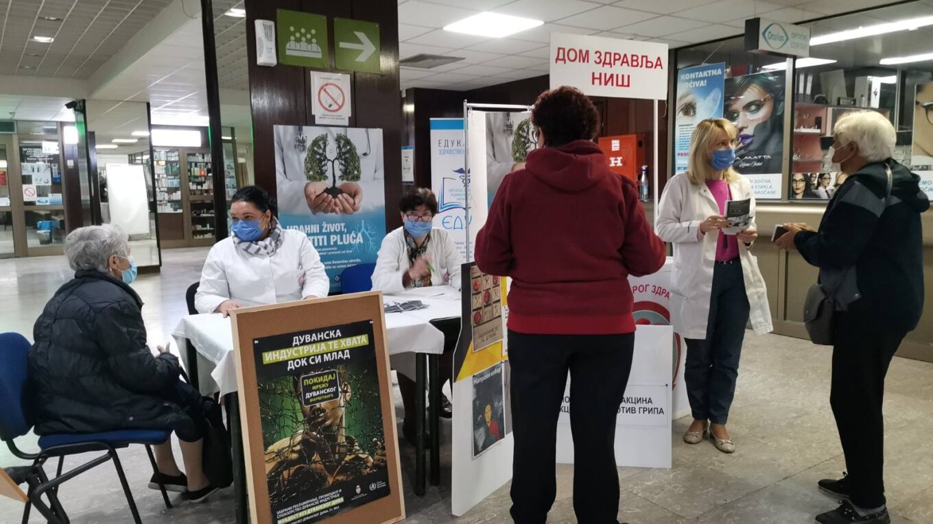 Поводом обележавања Међународног дана борбе против хроничне опструктивне болести плућа, Центар за превентивне здравствене услуге Дома здравља Ниш организује низ активности. Почев од 07.11.2022. године, свакога дана у току ове седмице у периоду од 10:00 до 11:00 часова у централном холу установе, свим заинтересованим суграђанима радиће се упитник процене ризика за обољевање од хроничне опструктивне болести плућа (ХОБП). Медицинске екипе овом приликом, указаће и на значај вакцинације као једне од најзначајнијих мера у превенцији болести плућа. Дом здравља Ниш тренутно располаже довољним количинама вакцине против сезонског грипа, пнеумокока и ковида 19.