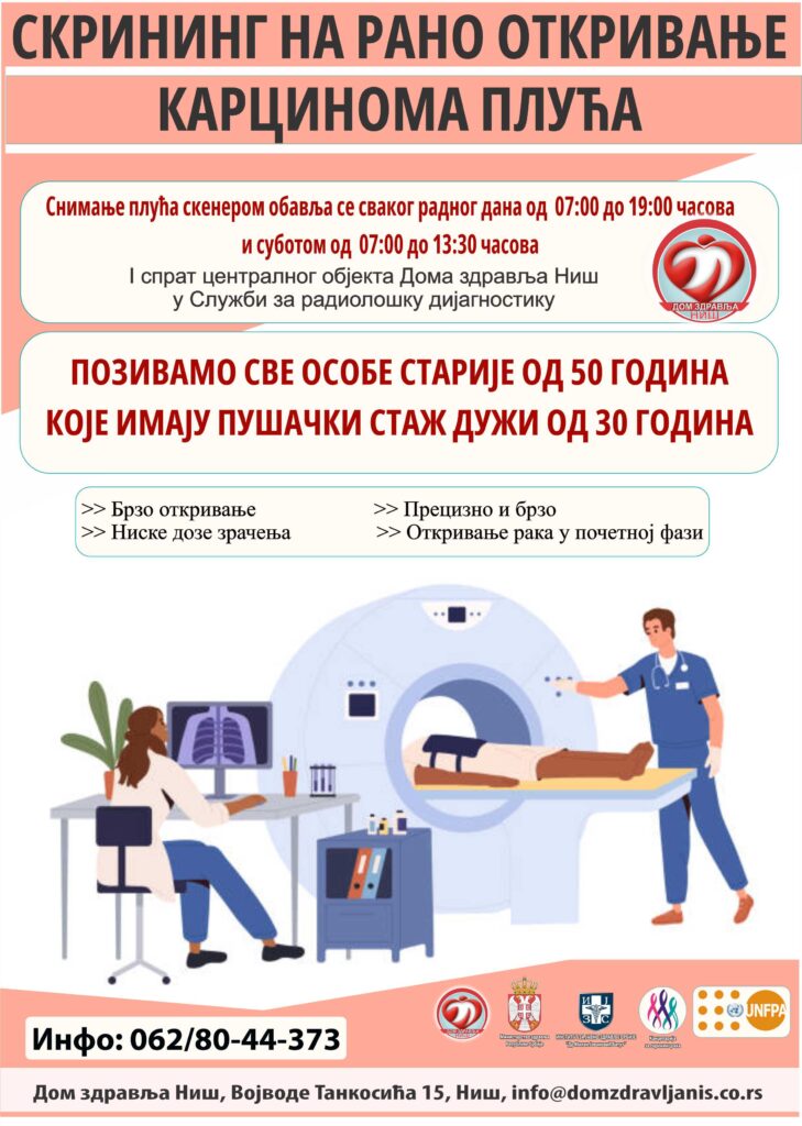 Дом здравља Ниш пружа услугу скрининга на карцином плућа уз помоћ савремене low-dose ЦТ технологије, сваког радног дана од 07:00 до 19:30 часова и суботом од 07:00 до 13:30 часова. Информације можете добити путем телефона 0628044373 или лично на првом спрату централног објекта Дома здравља Ниш у Служби за радиолошку дијагностику- шалтер за скенер плућа и мамографију.